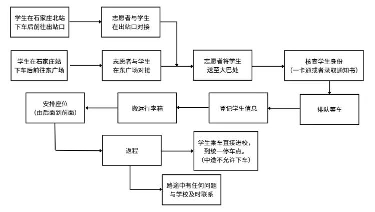 具体内容:新生出站后(到达石家庄站的新生由东广场出站),寻找手持足球一世 666814标志的志愿者,由接新志愿者引导、登记、乘车,每位学生最多带两位家长乘车。